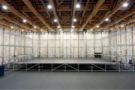 A. 一般的なレンタルステージの耐荷重は1平米あたり約500kg〜750kg(大人7〜10人分程度)と非常に頑丈です。ただし、ジャンプなどの動作は重さ以上の衝撃が加わるため、補強が必要になる場合があります。激しい動きの演出が想定される場合は、あらかじめ用途をご相談ください。