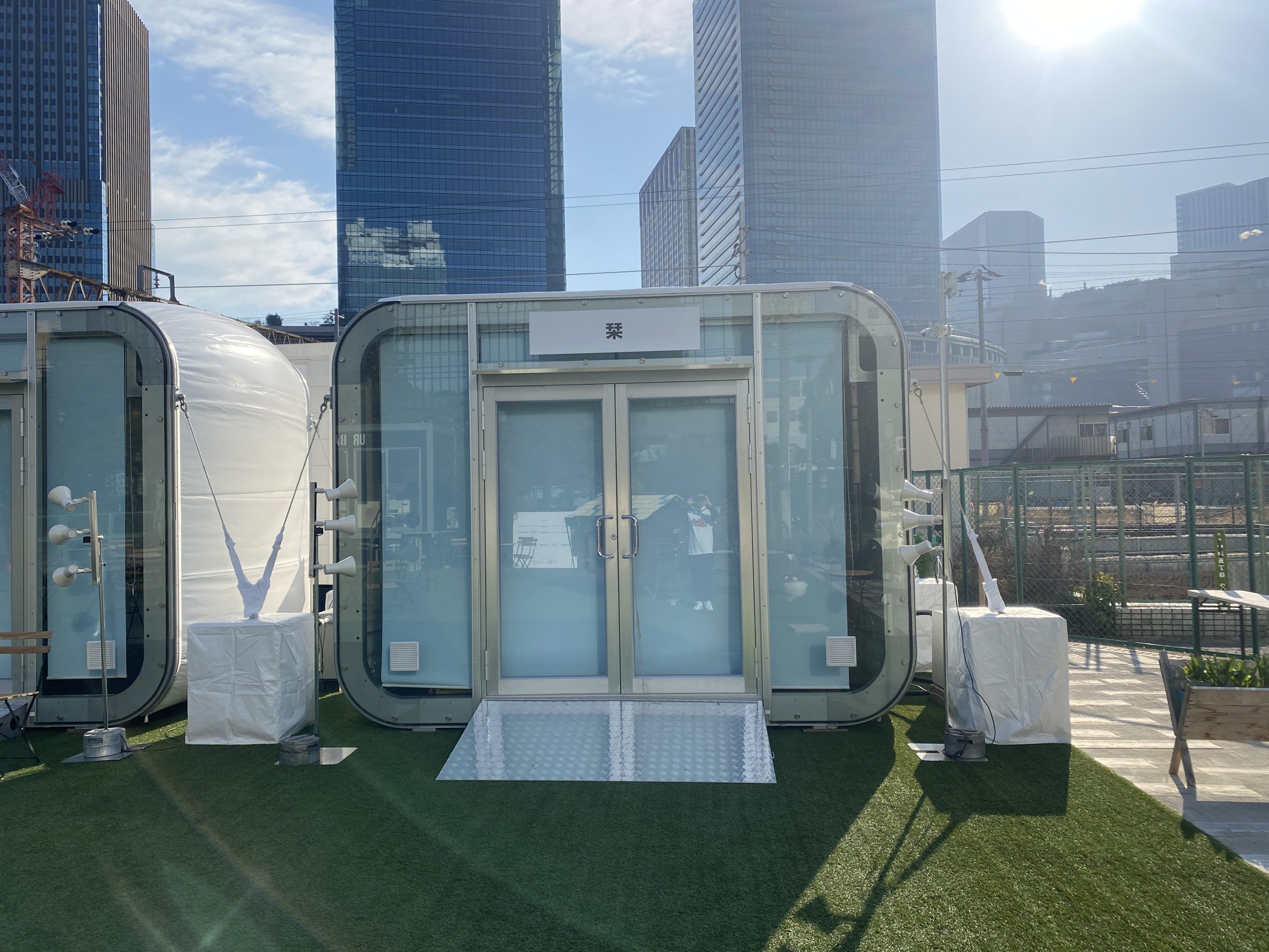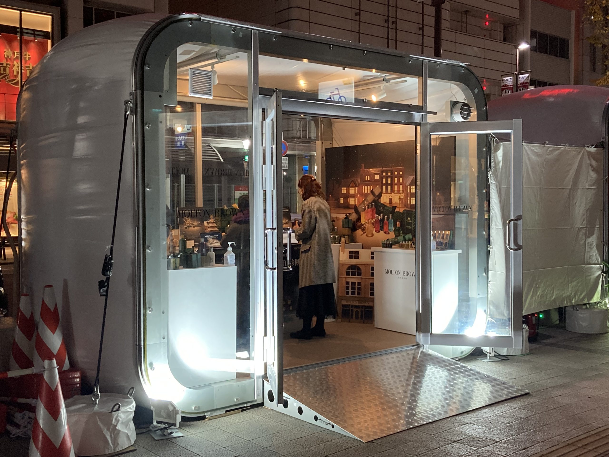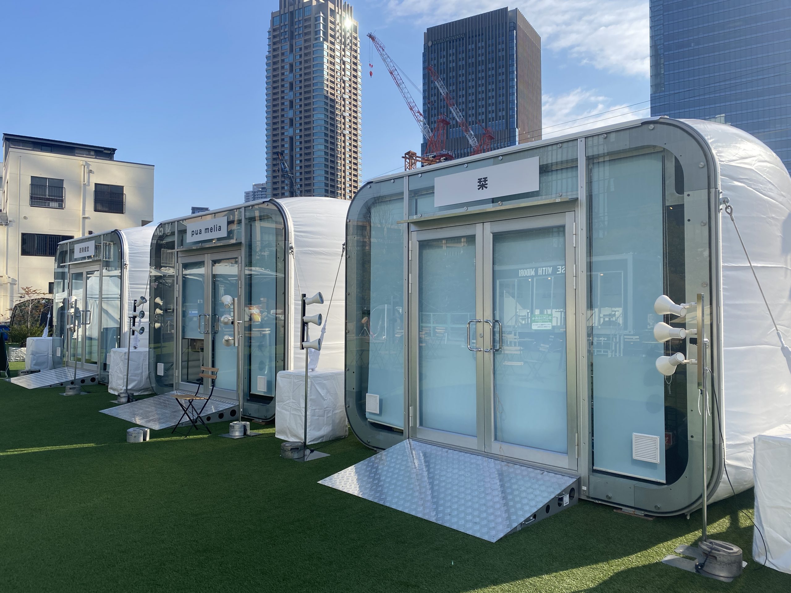 【斬新なデザイン】 「ポップアップショップ」のイメージ。従来のテントを覆す斬新なデザイン。フローリング付きで、雨水の侵入を防止。奥行側に連棟すれば、2.5mピッチで拡張が可能です。